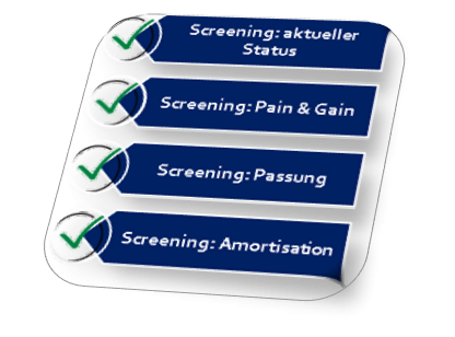 In einem für Sie kostenfreien 90minütigen Screening erhalten Sie eine transparente Entscheidungsbasis, welche Optimierungsmaßnahmen für Sie relevant sind und wie sich eine Amortisation darstellt.